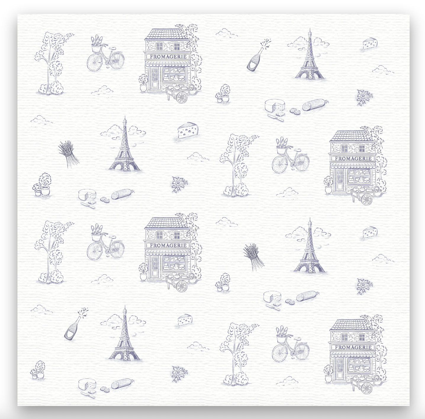 Bring a touch of Paris to your presents with this Parisian Fromagerie Toile Wrapping Paper, featuring hand-drawn illustrations of a cozy cheese shop, bicycles, baguettes, and the Eiffel Tower. Inspired by life between California and Paris, this design captures the charm of French markets and the romance of slow, simple living.
